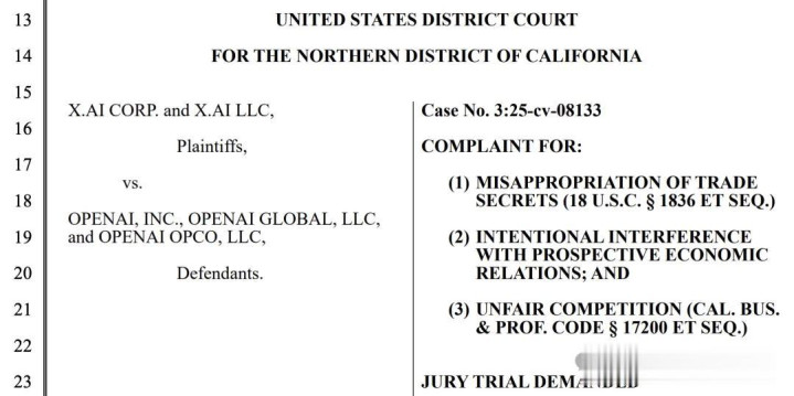 从法律层面看,xAI对OpenAI的指控一共有三项,分别是违反联邦商业秘密保护法、蓄意干扰xAI与员工的经济预期关系,以及违反加州不正当竞争法。